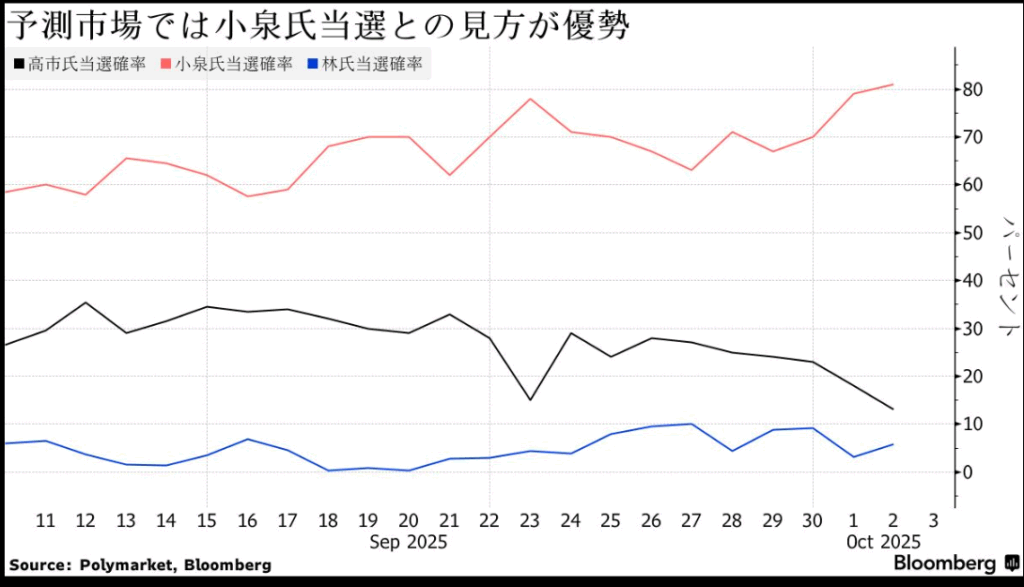 週明けの東京市場では、自民党総裁選で高市早苗前経済安全保障担当相が予想外に勝利したことを受け、景気刺激策への期待から株式相場の上昇が見込まれる半面、金融や財政の緩和的な政策姿勢を背景に円相場と超長期国債には下落圧力がかかるとの見方が広がっている。