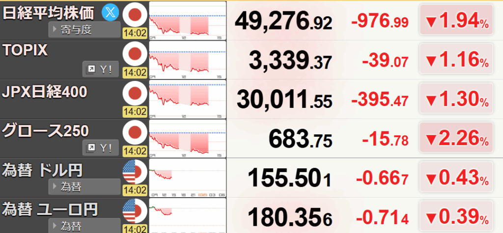 日経平均は1,000円近く下落し、ドル円の為替レートも155円台になっています。