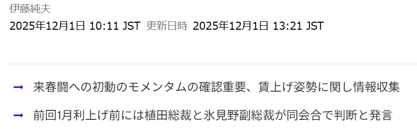 野村証券の岩下真理エグゼクティブ金利ストラテジストは、植田総裁が10月会合後の会見で利上げの判断基準とした春闘の初動のモメンタムについて、講演で示した賃金をめぐる環境と動きの図表などを見ると「利上げの準備は整ったと言っているとしか聞こえない」と指摘。12月利上げの可能性が高まったとみる。