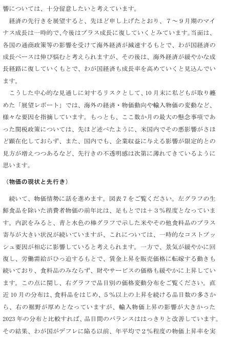 植田総裁は賃金動向に関して、賃上げ原資の企業収益は「関税政策の影響を加味しても、全体として高い水準が維持される見通し」と語った。現在は賃金価格設定行動が継続するかを「見極めていく段階にあり、特に来春闘に向けた初動のモメンタムを確認することが重要」との考えを改めて示した。