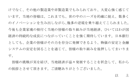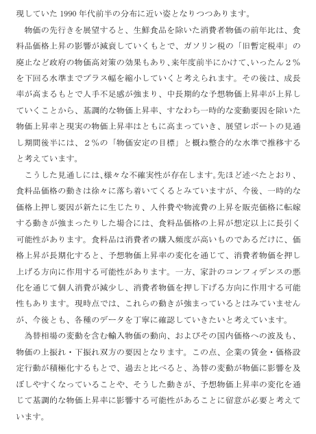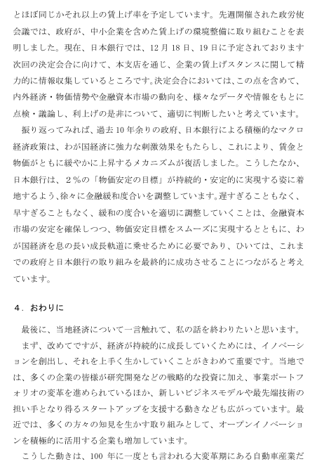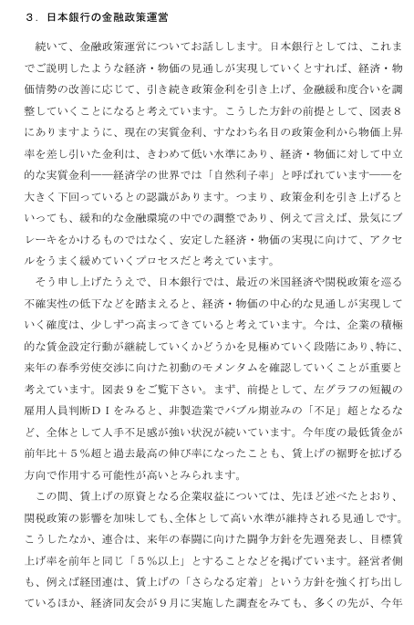 名目の政策金利から物価上昇率を差し引いた実質金利は極めて低水準で、経済・物価に対して中立的な自然利子率を大きく下回っていると指摘。利上げは緩和的な金融環境の中での調整だとし、「景気にブレーキをかけるものではなく、「安定した経済・物価の実現に向けて、アクセルをうまく緩めていくプロセスだ」とも述べた。