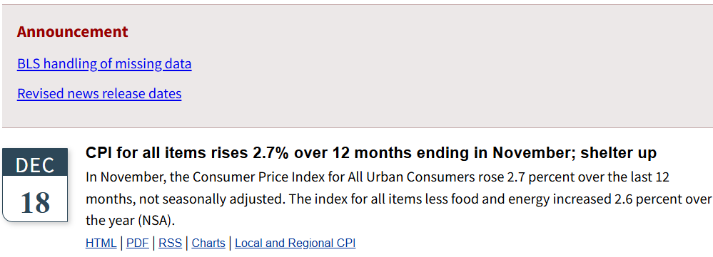 政府閉鎖により、BLSは通常の前月比の指数を計算する能力が制限され、代わりに9月から11月までの変化を主として観察する形となった。BLSは統計発表の前日に公表した文書で、一部データは完全には信頼できない可能性があると事前に注意喚起していた。