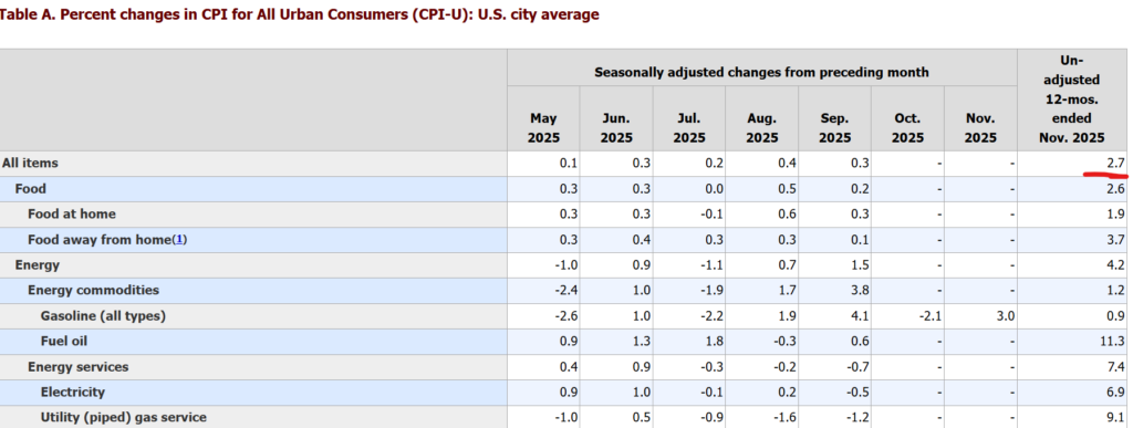 The Consumer Price Index for All Urban Consumers (CPI-U) increased 0.2 percent on a seasonally adjusted basis over the 2 months from September 2025 to November 2025, the U.S. Bureau of Labor Statistics reported today. Over the last 12 months, the all items index increased 2.7 percent before seasonal adjustment. BLS did not collect survey data for October 2025 due to a lapse in appropriations. The seasonally adjusted index for all items less food and energy rose 0.2 percent over the 2 months ending in November. From September to November, the index for shelter increased 0.2 percent. The energy index rose 1.1 percent over the same 2-month period and the food index increased 0.1 percent. Other indexes which increased over the 2 months ending in November include household furnishings and operations, communication, and personal care. In contrast, the indexes for lodging away from home, recreation, and apparel decreased over the same 2-month period. The all items index rose 2.7 percent for the 12 months ending November, after rising 3.0 percent over the 12 months ending September. The all items less food and energy index rose 2.6 percent over the last 12 months. The energy index increased 4.2 percent for the 12 months ending November. The food index increased 2.6 percent over the last year. -------------------------------------------------------------------------------------------------------------- Federal Government Shutdown BLS did not collect survey data for October 2025 due to a lapse in appropriations. BLS was unable to retroactively collect these data. For a few indexes, BLS uses nonsurvey data sources instead of survey data to make the index calculations. BLS was able to retroactively acquire most of the nonsurvey data for October. CPI data collection resumed on November 14, 2025. Additional information about the impact of the shutdown on CPI data is available online at--------------------------------------------------------------------------------------------------------------- Access Denied