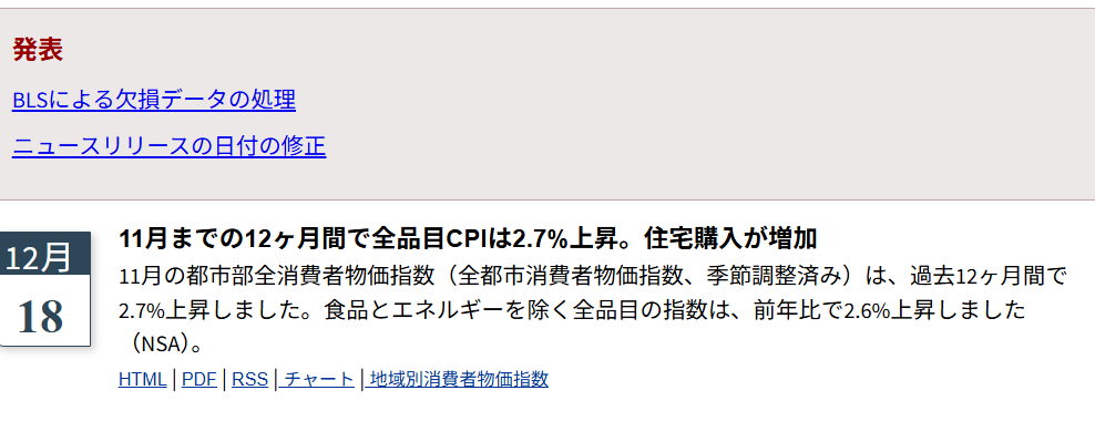 日本時間の22:30にアメリカのCPI 11月,がアメリカ労働局BLSより発表されました。