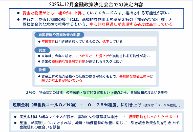 12月19日、日銀の植田総裁は金融政策決定会合で政策金利を30年ぶりの高水準となる0.75%への引き上げを決める0.75%にすると発表しました。