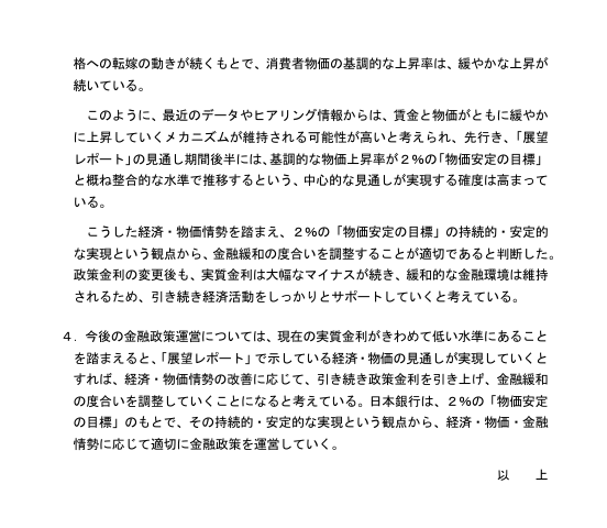 植田和男総裁は会合後の記者会見で、2%の物価安定目標の実現が視野に入る中、「適切なタイミングで利上げ判断をすることが物価を2%にスムーズに着地させるために必要だ」と指摘。賃金が想定通りに上がれば基調的な物価は下がらないとし、物価に波及する動きが続けば「利上げが見えてくる」と政策正常化に意欲を示した。