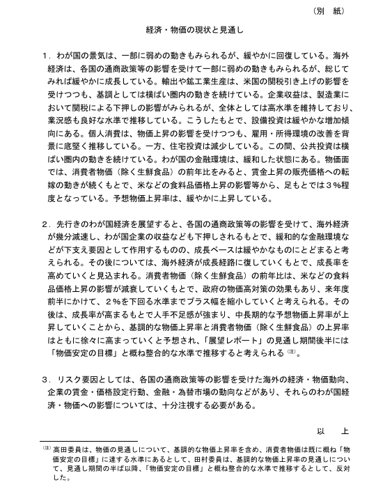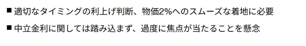 日銀ではもともと利上げのタイミングで中立金利に対する新たな見解を示せば、政策判断やコミュニケーションの重要な要素と受け止められ、過度に焦点が当たってしまうことを懸念していた。引き続き、利上げに伴う経済・物価の反応を点検しながら中立金利の水準を探っていく考えだ。