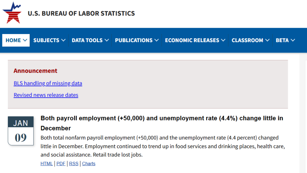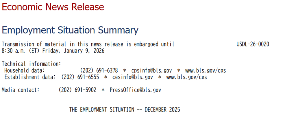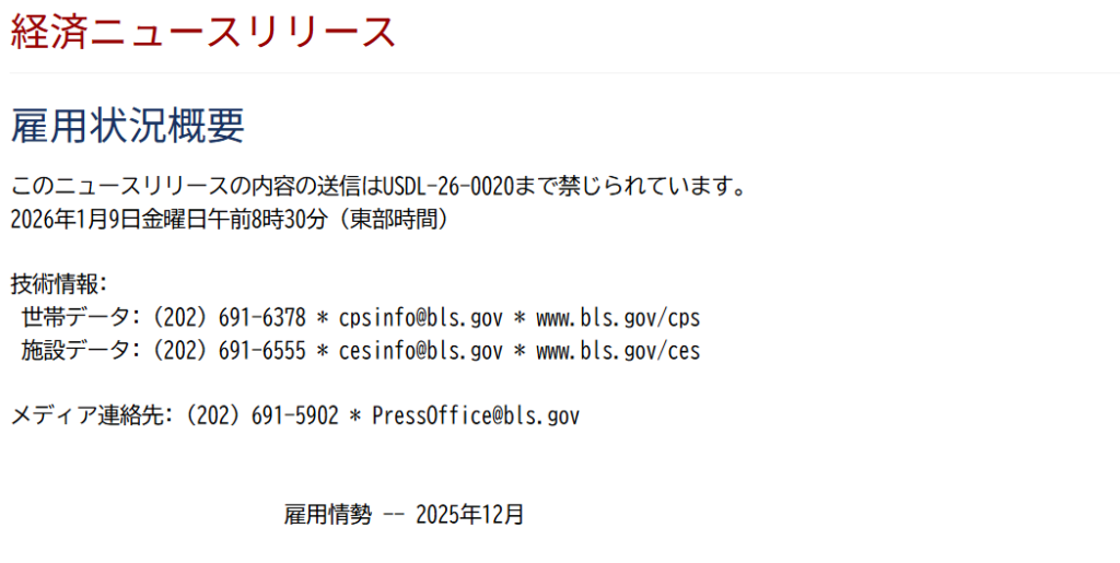 1月9日 日本時間22:30、アメリカ雇用統計がBLSより発表されました。2025 12月分です。