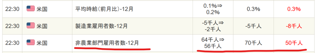 非農業部門雇用者数2025 12月は予想値7.0万人に対して結果5.0万人でした。