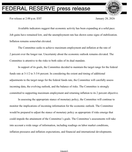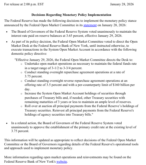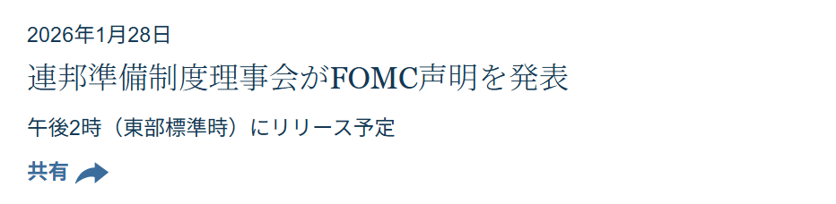 委員会は、目標達成を支援するため、フェデラルファンド金利の目標誘導レンジを3.5~3.75%に維持することを決定しました。フェデラルファンド金利の目標誘導レンジの追加調整の範囲と時期を検討するにあたり、委員会は今後入手するデータ、変化する見通し、そしてリスクのバランスを慎重に評価します。委員会は、最大雇用の実現とインフレ率の目標2%への回帰に強くコミットしています。