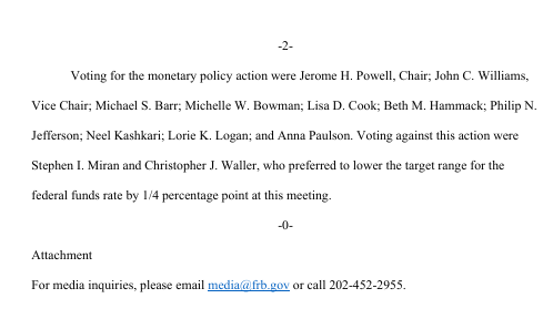 金融政策措置に賛成票を投じたのは、ジェローム・H・パウエル議長、ジョン・C・ウィリアムズ副議長、マイケル・S・バー、ミシェル・W・ボウマン、リサ・D・クック、ベス・M・ハマック、フィリップ・N・ジェファーソン、ニール・カシュカリ、ローリー・K・ローガン、そしてアナ・ポールソンである。反対票を投じたのは、スティーブン・I・ミランとクリストファー・J・ウォーラーであり、両氏は今回の会合でフェデラルファンド金利の誘導目標レンジを0.25パーセントポイント引き下げることを希望した。