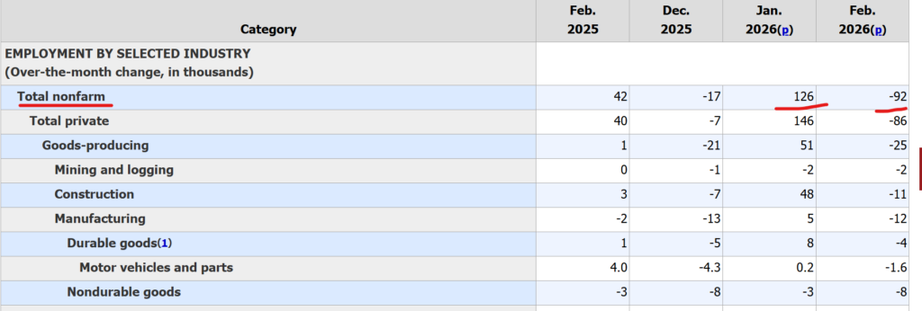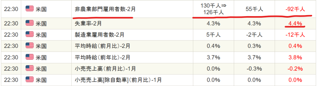 非農業部門雇用者数2026 2月は予想値5.5万人に対して結果マイナス9.2万人でした。
