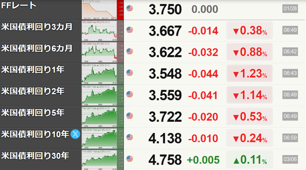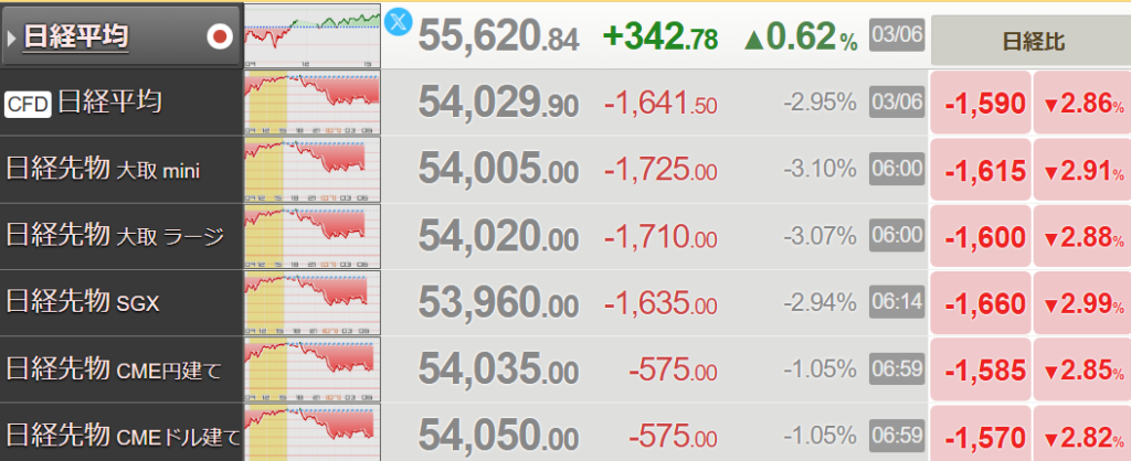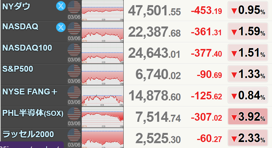 アメリカの市場は下落です。特にSOX半導体指数が3.92%の大きな下落です。