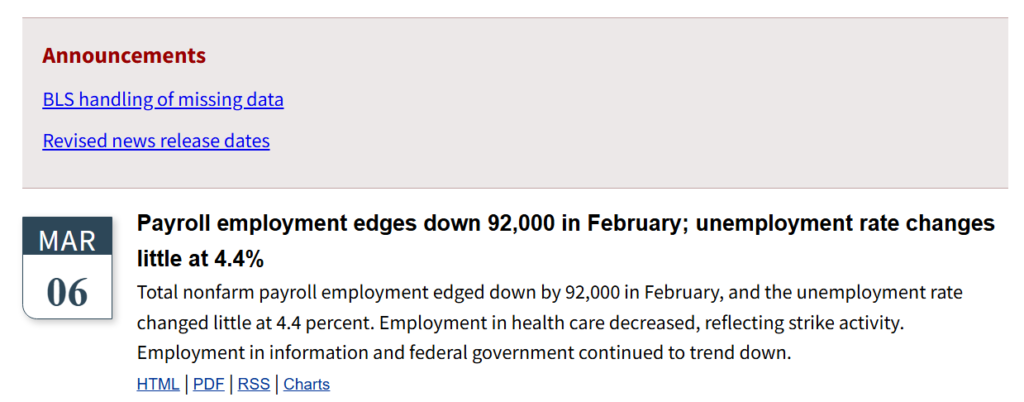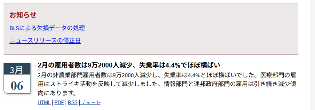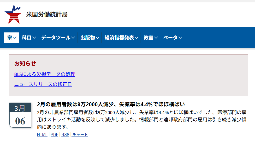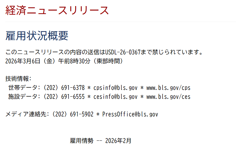 3月7日 日本時間22:30、アメリカ雇用統計がBLSより発表されました。2026 2月分です。