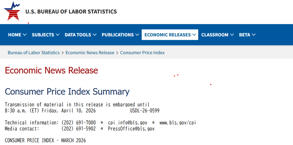 2026年4月の消費者物価指数は、2026年5月12日(火)午前8時30分(米国東部時間)に発表される予定です。